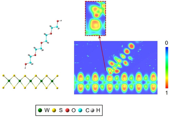 The electronic properties around the interaction site in structure 2 will be discussed by analyzing the electron localization function. ELF provides an interesting depiction of the bonding based on the probability of finding electrons around neighbor elements ranging from 0 to 1 [43,44,45,46,47]. The ELF plots focused on the H atom of the H–O group from PEG molecule are shown in Figure 3. The colors of the plots are indicative of the probability of finding electrons in a region of the space between the H from PEG and S from WS2. A modification of the contour plot around the O–H–(Ssheet) interaction can be observed. The directionality of this interaction is shown in the dotted square of the enlarged image in Figure 3. The overlap shown by the green-blue color electron localization outlines between S and the H from the surfactant is indicative of the stability of the S–H interaction. This stability is understandable in van der Waals solids such as WS2 because they present a certain tendency to interact with other molecules through weak intermolecular forces [29]. So, the ELF results may provide information of interest for giving feedback in the preparation of the nanofluid. According to the ELF results, nanosheet WS2 structures may be favored with the presence of hydrogen bonding surfactants such as PEG. In the present case, the ELF analysis corroborates the hydrogen bond interaction between the hydroxyl terminal group from the PEG molecule and the S atoms from the surface of the WS2, which stabilizes the nanosheet when the exfoliation process is applied.
