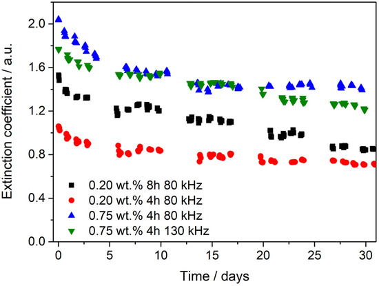 Several measurements were performed involving different techniques to assess the stability of the nanofluids since agglomeration and sedimentation processes lead to negative effects on heat transfer, such as pressure drops and even clogging of the pipes through which nanofluids circulate. Accordingly, UV-Vis spectra, particle size and zeta potential measurements were analyzed for thirty days. Figure 4 illustrates the evolution over time of the extinction coefficient obtained at λ = 629 nm from UV-Vis spectra for the nanofluids. At that value of wavelength there is a characteristic absorption band of WS2 [30]. Initially, the highest extinction coefficient values were found for the nanofluids prepared with 0.75 wt. % of PEG in HTF, which reveals that the exfoliation process is more successful using this concentration of PEG. Among the nanofluids prepared with 0.75 wt. % of PEG, the nanofluid prepared using a sonication frequency of 80 kHz seems to be more stable since the extinction coefficient remains invariable after 13 days while the nanofluid prepared using a frequency of 130 kHz began to be stable in the 21st day. In the case of the nanofluids prepared with 0.20 wt. % of PEG in HTF, the initial extinction coefficient values were lower than those of the nanofluids prepared with the higher PEG concentration, which means that less nanomaterial was obtained in the exfoliation process. Among these, the nanofluid prepared by means of an LPE process for 4 h seems to be more stable than the one prepared during 8 h, in which case the decrease of the extinction coefficient with time is about 45%. This nanofluid is the one that shows the least stability over time, so increasing the sonication time does not result in increased stability. After 30 days, the nanofluids with the same amount of PEG showed similar extinction coefficient values, which means that the concentration of PEG has a greater influence than the sonication time and frequency on the amount of nanomaterial in the nanofluid during the LPE process. Moreover, although the extinction coefficient of 2D-WS2-based nanofluids decreases during the first days, the values after characterization are still high, which is of great interest for solar application since not only could the thermal properties of the HTF be improved but also the absorption of solar radiation may increase. Therefore, the most interesting nanofluid in terms of stability seems to be that prepared using a concentration of PEG of 0.75 wt. % and a sonication frequency of 80 kHz for 4 h because it shows the highest extinction coefficient value after 30 days being stable.