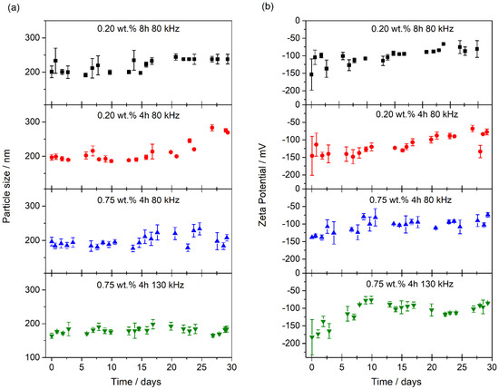 The evolution of the extinction coefficient is strongly dependent on the agglomeration of nanostructures since the fast sedimentation of clusters reduces the extinction coefficient values. Figure 5a shows the particle size measured by the DLS technique. The particle sizes for all the nanofluids were found to be between 150–250 nm. Nanofluids based on WS2 nanosheets show high stability since no significant changes in particle size were observed over time. However, we can observe that after 30 days the nanofluids prepared using a PEG concentration of 0.20 wt. % presented higher values (240 nm for 80 kHz for 8 h and 270 nm for 80 kHz for 4 h) than those obtained for the nanofluids prepared using 0.75 wt. % of PEG, which showed values of 200 nm in the case of the one prepared using 80 kHz and 180 nm for the one using 130 kHz. Probably, these values are not high enough to produce a strong sedimentation in the nanofluids. Therefore, the higher the concentration of PEG, the smaller the particle size.