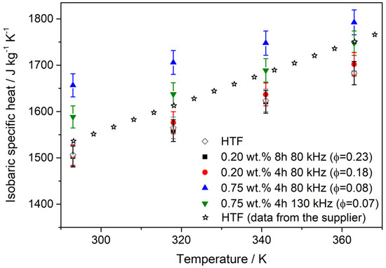 Isobaric specific heat values for nanofluids and pure HTF. The values for pure HTF from the supplier are included for comparison purposes.