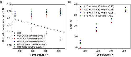 Thermal conductivity for nanofluids and pure HTF (a) and percentages of thermal conductivity enhancements for nanofluids compared to HTF (b). The values for pure HTF from the supplier are included for comparison purposes.
