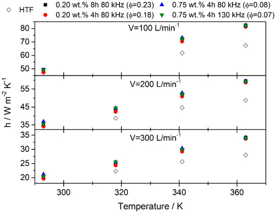 Considering these equations, we can find the exponents in the expression of heat transfer coefficient for density, viscosity, thermal conductivity and isobaric specific heat as was defined previously, being 0.8, −0.4, 0.6 and 0.4, respectively. Therefore, heat transfer coefficient was estimated for the pure heat transfer fluid and for the nanofluids at three flow rates, 100, 200 and 300 L/min. The values obtained for the heat transfer coefficients are shown in Figure 8. The results show an increase in the heat transfer coefficient when the flow rate increases, as expected. Additionally, the results show an enhancement in the heat transfer processes when nanofluids are used. Furthermore, this enhancement increases with temperature. The 2D-WS2 nanofluids in this study were prepared with different PEG concentrations and ultrasonic conditions but heat transfer is seen to improve in all cases. The nanofluid with the highest volume fraction (prepared using a PEG concentration of 0.20 wt. % and sonication frequency of 80 kHz for 8 h) is the nanofluid which shows the highest increase, up to 22.1%. Furthermore, the nanofluids with the lowest concentration of PEG were less stable and present less nanomaterial in the base fluid so it is likely that the presence of PEG is not beneficial in terms of thermal properties but it helps the fluids to reach temporal stability. For the nanofluid with a volume fraction of 0.08 vol. % (prepared using a PEG concentration of 0.75 wt. % and a sonication frequency of 80 kHz for 4 h), an increase in the heat transfer coefficient of 21.7% was found. This nanofluid was the most stable and the changes in the improvement of efficiency (with respect to the maximum obtained, 22.1%) is of the order of the uncertainty of the measurements, so this nanofluid would appear to be the most promising in terms of stability and thermal properties.