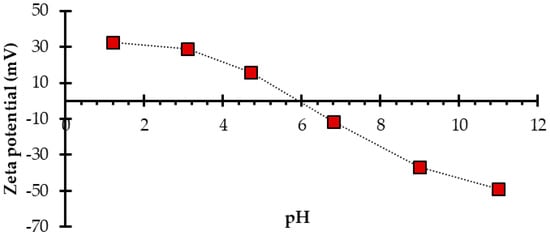 A NanoPlus-3 zeta/nanoparticle analyzer (Micromeritics, Norcross, GA, USA) was used to analyze the surface charge of particles and their dispersion stability at 25 °C (electrophoretic light scattering (ELS)). Nanoparticle/water suspensions were prepared with a pH adjusted to between 2 to 12 by adding solutions of 0.1 mol L−1 HCl or 0.01 mol L−1 NaOH, and then subjected to analysis. The zeta potential was calculated using the Smoluchowski equation, derived from the calculation of the Doppler effect [55,56,57].