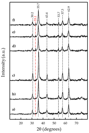 It is important to point out that similar 2θ positions are found in powder XRD patterns of cubic maghemite (γ-Fe2O3) which moreover presents a medium intensity 2θ peak at 32.17° among others of lower intensity such as the ones at 15.0 and 23.8° [37,38,39,40]. The absence of those peaks confirms the assignment of magnetite as the major phase present in every iron oxide synthesized (Figure 1). Without limiting the foregoing, the XRD patterns of the solids prepared with a nominal Fe3+/Fe2+ molar ratio of 4 show an additional low-intensity peak at ca. 33.1°, which is not observed for those obtained from a nominal Fe3+/Fe2+ molar ratio of 2. The 2θ peak at 33.1° can be assigned to the presence of hematite (α-Fe2O3) as a minority phase since it appears as the highest relative intensity diffraction for the main rhombohedral hematite ICSD (Inorganic Crystal Structure Database) references (01-079-0007, 00-024-0072, 01-072-0469, 01-085-0599). Indeed, the hematite content was found below 10% from a semiquantitative analysis of the XRD data by X’Pert Highscore Plus software.