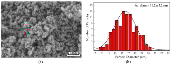 From the analysis by field emission scanning electron microscopy (FESEM), a nanometric spherical morphology was found for the crystalline Fe3O4 particles prepared. An example is displayed in Figure 2 for the highest surface magnetite substrate selected to incorporate the noble metals in the next step. The elemental chemical microanalyses by X-ray energy dispersive spectroscopy (EDS), from a number of FESEM images showing similar homogeneous distribution of nanosized spherical particles, including those in Figure 2, confirmed an averaged Fe:O stoichiometry of 3.0 (±0.3):4.1 (±0.3) consistent with the magnetite Fe3O4 structure assigned from the powder XRD results (Figure 1). A representative statistic study of the crystallite size distribution from the FESEM micrographs of the highest surface magnetite, whose resulting histogram is displayed in Figure 2, illustrates an average Fe3O4 particle diameter of 16.2 ± 3.2 nm.