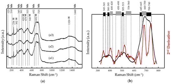 Regarding maghemite, its strongest band is usually described as consisting of two components whose maxima are reported within 645–665 cm−1 and 700–740 cm−1 ranges [48]. Additionally, a magnon band centered at ca. 1440 cm−1 and two low-intensity peaks at 125 and 210 cm−1 are also typical of maghemite structure [66,69]. Unfortunately, the characteristic Raman features linked to magnetite (at ca. 547 and 680 cm−1) overlap with the three major bands cited for maghemite, which make difficult unambiguous statements about magnetite just based on the Raman spectrum when maghemite is present as well. A tool that might help to clarify this is the second derivative of the Raman spectrum. For this purpose, a high-resolution Raman spectrum within the region of interest was collected for the Fe3O4-based substrate, this time after being submitted to the same reduction treatment (250 °C/2 h in H2) as the noble metal-containing samples. The spectrum obtained and its second derivative are displayed in Figure 7b. Regardless of the higher resolution, the Raman spectrum is very similar to that obtained from the pristine substrate within the same region (Figure 7a1) which leads to identical conclusions. Nevertheless, the second derivative shows a resolved accurate position for the maxima associated to the vibrational Raman modes among which it is possible to distinguish a maximum within the 534–560 cm−1 region (Figure 7b), where no maximum but the one from a weak vibrational mode of magnetite is reported [63,66].