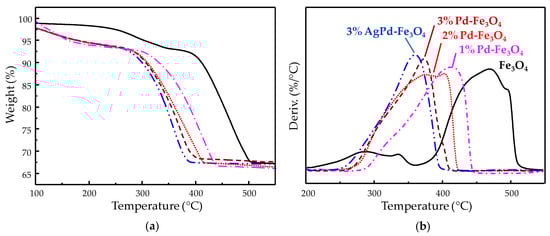The derivative TG curve, within the major reduction region, is displayed in Figure 8b, where the maximum of the major peaks correspond to the temperature for the maximum rate of Fe3O4 reduction which decreases following the next trend: Fe3O4 (468 °C) > 1% Pd-Fe3O4 (412 °C) > 2% Pd-Fe3O4 (376 °C) > 3% Pd-Fe3O4 (370 °C) > 3% AgPd-Fe3O4 (358 °C). According to this sequence, the Fe3O4 reducibility seems to be enhanced as the Pd load increases (from 1 to 3 wt.%) in the monometallic catalysts. Nevertheless, the tendency breaks for the 2.4 wt.% Pd load in the bimetallic 3% AgPd-Fe3O4 catalyst for which the doping with Ag forming the Ag0.2Pd0.8 alloy appears to favor the lowest temperature for Fe3O4 reduction at 358 °C (i.e., the highest reducibility).