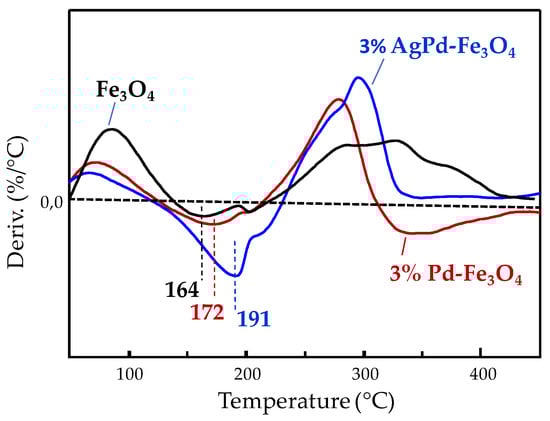 A thermogravimetry (TG) analysis under oxidizing conditions (dry air stream) was also performed in three representative samples, in order to distinguish whether the effect on the redox properties of iron species, observed by the drop in their reduction temperature, goes further than the spillover effect of atomic hydrogen produced by catalyzed H2 dissociative adsorption on Pd [83,84]. Thus, Figure 9 displays the first derivative of the TG curve collected under synthetic air flow for 3% Pd-Fe3O4 and 3% AgPd-Fe3O4 catalysts, and their pristine Fe3O4 substrate. The first negative peaks observed in Figure 9 within the 150–200 °C range correspond to the maximum rate of weight gain produced by oxygen insertion causing Fe2+ oxidation to Fe3+, for which the corresponding temperature, appearing at 164 °C in the metal-free Fe3O4 increases in the noble metal-containing catalysts, especially in the bimetallic 3% AgPd-Fe3O4 with the maximum at 191 °C. Therefore, the redox properties of iron species undergo generalized changes induced by the Ag and/or Pd nanostructures supported, whereby the Fe3+ species become easier to reduce (i.e., present higher oxidizing power), while the Fe2+ ones become harder to oxidize. The strong correlation, existing between the trend in the change of the mixed iron oxide redox properties and the increased productivity to formaldehyde, points to a significant metal–support interaction that seems to be responsible for the tendency observed in the catalytic behavior of the different nanocomposite catalysts.