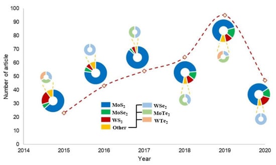 The number of research articles that applied transition metal dichalcogenides (TMDCs) in gas adsorption application between the year 2015 to April 2020, where pie charts represent the utilization percentage of various types of TMDC. Queried from Scopus Database []. Copyright Elsevier B.V., 2020.