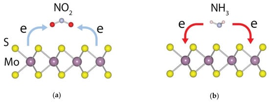 (a) Mechanism of electron-accepting NO2 gas molecule on MoS2 surface and (b) mechanism of electron-donating NH3 gas molecule on MoS2 surface (Reproduced with permission from []. Copyright 2015 Springer Nature Limited CC BY-NC-ND 4.0).