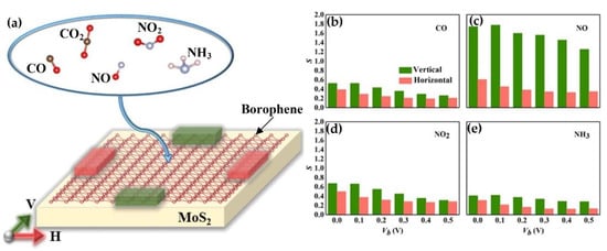(a) Direction-sensitive borophene/MoS2 heterostructure for multiple climate gas detection. Sensitivity and directional bias voltage of (b) CO, (c) NO, (d) NO2, and (e) NH3 in the horizontal and vertical direction (Reproduced with permission from []. Copyright 2020 Elsevier B.V.).