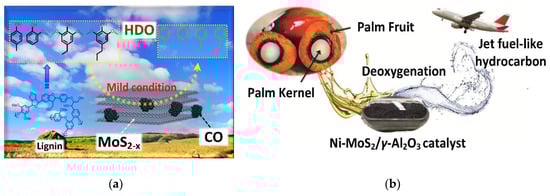 (a) Hydrodeoxygenation (HDO) of lignin-derived phenols into arenes using Co-MoS2−x (Reproduced with permission from []. Copyright 2020 American Chemical Society) and (b) deoxygenation of palm kernel oil to jet fuel-like hydrocarbon using catalysts (Reproduced with permission []. Copyright 2017 Elsevier B.V.).