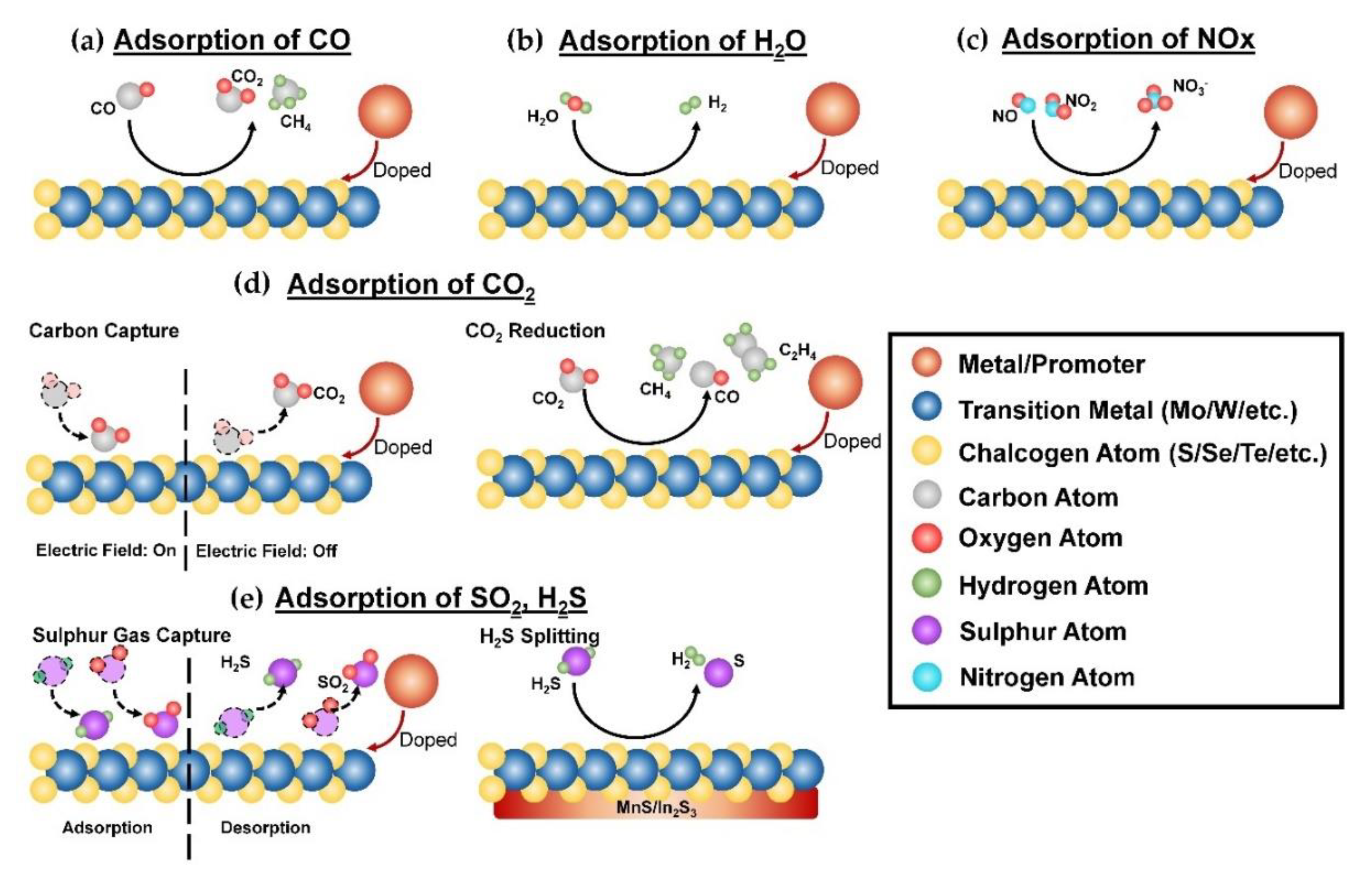 Schematic diagrams for the adsorption processes of (a) CO, (b) H2O, (c) CO2, (d) sulphur content, and (e) NOx with the use of TMDCs.