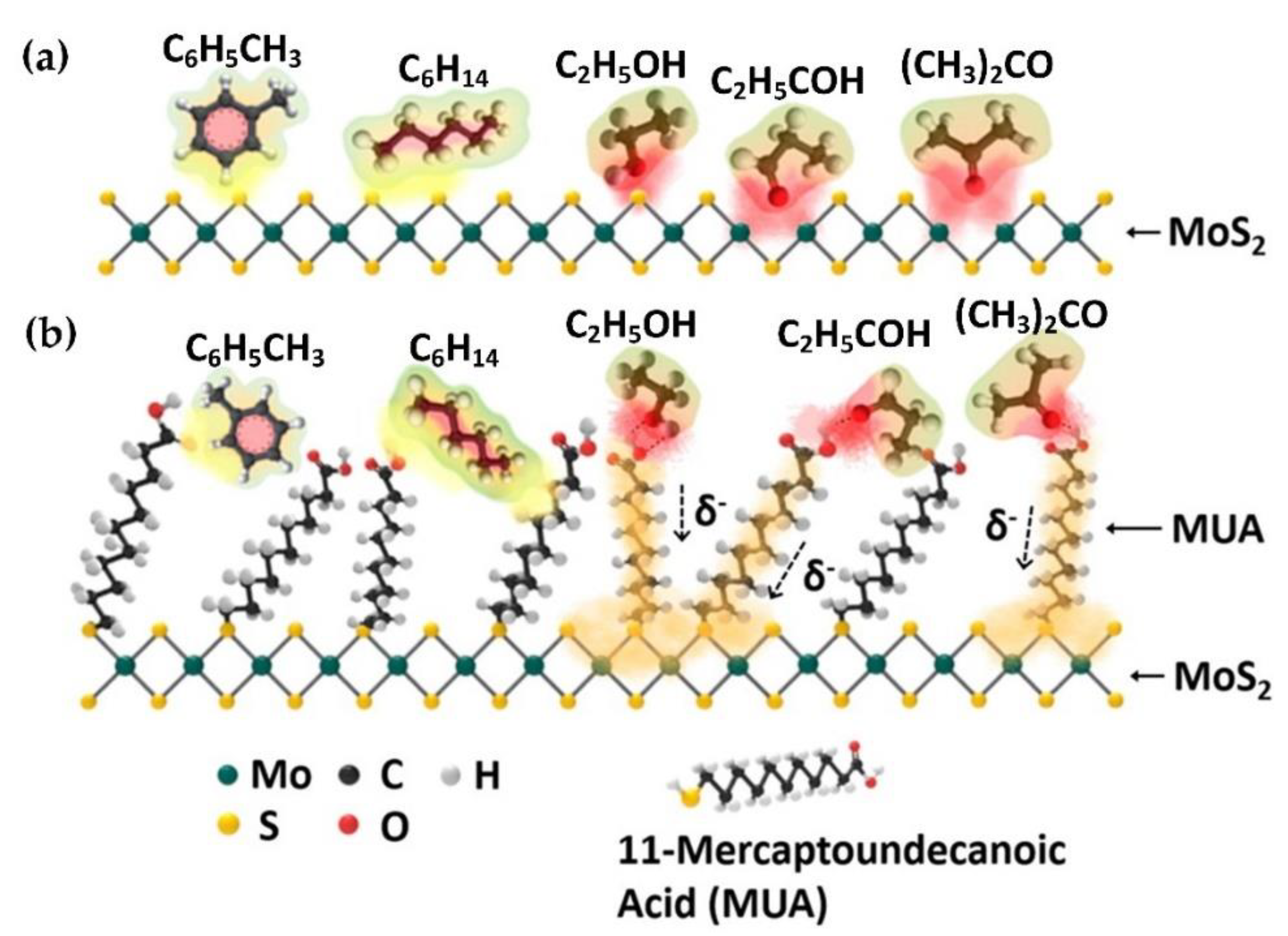 (a) Gas sensing mechanism for volatile organic compounds (VOC); toluene, hexane, ethanol, propanal, and acetone) gas molecule on primitive MoS2 surface and (b) improved VOC sensing performance by Mercaptoundecanoic acid (MUA)-conjugated MoS2 due to increased charge carrier density (Reproduced with permission from []. Copyright 2014 American Chemical Society).