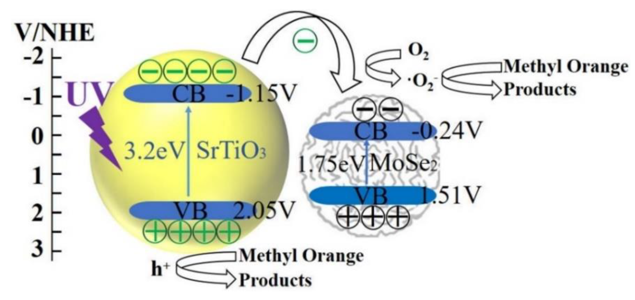 As the majority of water treatment facilities are located outdoors, the availability of solar energy can be useful for photocatalytic technology in water treatment. Chu et al. [] reported that the development of hexagonal 2H-MoSe2 photocatalyst exhibits outstanding photo-absorption and photocatalytic reaction in reducing hexavalent chromium (Cr(VI)) under ultraviolet (UV) light. The 2H-MoSe2 yields 99% Cr(VI) reduction rate with the presence of UV light. Mittal and Khanuja [] revealed that MoSe2 is a good photocatalyst not only for Cr(VI) but also for methylene blue (MB) and RhB. The MoSe2/strontium titanate (SrTiO3) heterostructure also showed great potential as a wastewater treatment photocatalyst with a degradation rate of methyl orange at 99.46% under the optimum loading weight of 0.1 wt.% under UV light []. It is also found that there is no significant loss in the performance of MoSe2/SrTiO3 after reuse for 6 times. The working principle of MoSe2/SrTiO3 photocatalyst is demonstrated in Figure 8.