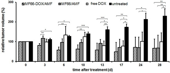The presence of magnetic hyperthermia combined with DOX-functionalized (MF66-DOX) or non-functionalized MF66-MNPs led to a distinct reduction of tumor volumes in mice compared to untreated ones during the period of investigation (28 days; Figure 2). Here, the relative tumor volumes decreased up to 50% compared to the initial volume measured at the beginning of the experiments (Figure 2). In the case of treating tumors with DOX-functionalized (MF66-DOX) MNPs, the tumor volume regression was obvious at six days post-treatment, whereas this effect was delayed (17 days post-treatment) when non-functionalized MF66-MNPs were applied. The additive effect of DOX and magnetic hyperthermia in reducing tumor volumes (by utilization of functionalized MNPs) was detectable up to day 17. Interestingly, the treatment of mice with the free ligand DOX (comparable concentrations as coupled to MNPs) initially seemed to promote tumor growth up to day 10. Later on, tumor growth was rather inhibited, but the effect was comparable with functionalized DOX and non-functionalized MNPs in combination with magnetic hyperthermia (no statistical difference; Figure 2). Particularly in relation to DOX-functionalized (MF66-DOX) MNPs, a high percentage of the tumor surface was covered with temperatures higher than 43 °C (Figure S3).