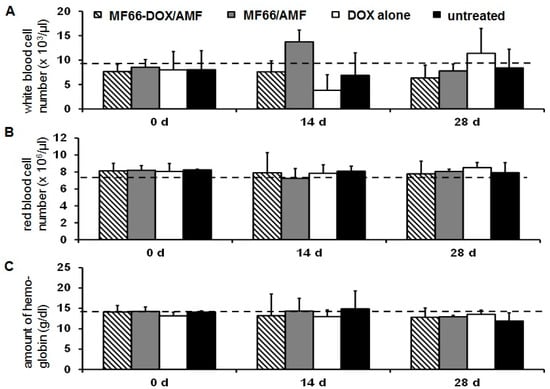 With consideration of the effect on the blood composition of tumor-bearing mice, the presence of non-functionalized MF66-MNPs combined with magnetic hyperthermia led to a temporary increase of white blood cells (14 days after treatment, Figure 3A). By contrast, the free ligand DOX remarkably reduced the number of white blood cells (14 days after treatment, Figure 3A). Both effects reversed to normal values later on (28 days post-therapy). The number of red blood cells, as well as the hemoglobin concentration, was not altered (Figure 3B,C).