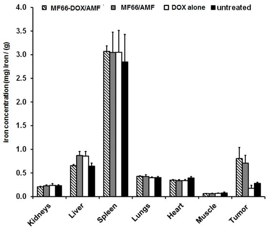 Moreover, the DOX-functionalized MNPs did not have an effect on the iron concentration in different organs in comparison untreated animals (Figure 4), when intratumorally injected. This also applies for the magnetic hyperthermia application.
