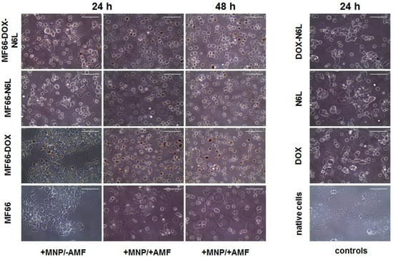 Microscopic analyses clearly revealed morphological changes and a detachment of BT474 cells after the combined treatment with magnetic hyperthermia and bi-functionalized (MF66-DOX-N6L) MNPs as well as with DOX-functionalized (MF66-DOX), such effects were most pronounced at 48 h after treatment (Figure 6). Here, the majority of cells showed rounded phenotypes (Figure 6). Moreover, fluorescence microscopy revealed the presence of DOX and iron inside the cells after exposure to the MNPs (Figure S4).