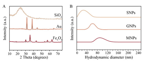 (A) XRD patterns of SNPs (top), GNPs (middle), and MNPs (bottom). Black vertical lines are showing reference to JCPDS file No. 19-0629 and JCPDS file No. 2-1095. (B) hydrodynamic diameter distribution of SNPs (top), GNPs-30 (middle), and MNPs (bottom).