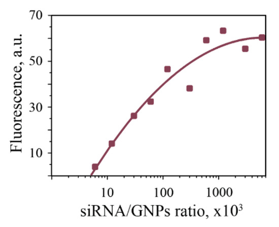 Relative fluorescence intensity of gold nanoparticles-siRNA (GNPs-siRNA) complexes, stained with acridine orange.
