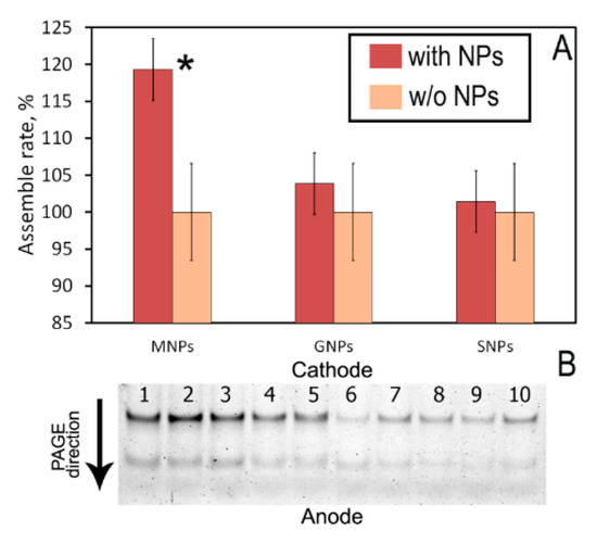 Figure 4B presents an example of PAGE. Hybridized siRNA migrates in gel slower than single-stranded sense (S) and antisense (As) siRNAs because it has higher molecular weight, than separate siRNA strands. So, the upper bend in gel corresponds to the hybridized siRNA, while the lower bend is single-stranded sense (S) and antisense (As) siRNAs. The intensity of bands (in terms of greyscale) corresponds to the amount of siRNA in the band. Particularly, in Figure 4B, lanes 1 to 5 is a sample with MNPs and lanes 6–10 is a control sample without nanoparticles. As we can see by a naked eye, the intensity of upper bands in lanes 1–5 much higher than of upper bands in lanes 6–10. To prove it quantitatively, we performed image analysis as described in the Methods section.