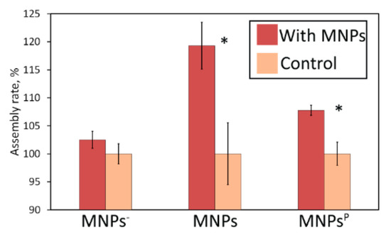 We performed additional experiments with negatively charged MNPs and PEG-coated MNPsP to verify the hypothesis that the HR depends mostly on charge-to-size ratio and charge sign. Figure 6 presents the results. We observed no increase in HR with MNPs−, which indicates that the composition of NPs (e.g., [Fe2+] and [Fe3+] ions) does not play a key role in the hybridization process. Concurrently, MNPsP shows an almost 8% increase in HR. Taking into account the considerable broadening of hydrodynamic sizes of MNPsP upon pegylation, we can speculate that there is some critical value of the charge-to-size ratio that assists hybridization. Additionally, surface modification and its effect on HR needs further investigation. The highest value of charge density for MNPsP is 0.55 a.u., which is almost the same as for pure MNPs, as can be seen from Table 1. According to our assumption, high charge density is beneficial, but not in this case, since HR for MNPsP is only 8% higher than the control value. Additionally, MNPs have a relatively narrow range of ratio values, which means that almost all of the particles can act as effective centers of hybridization, while in other systems particles meet these criteria only partially.