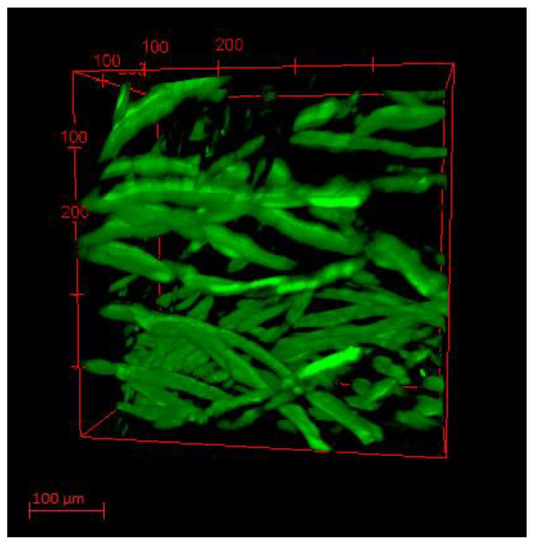 Tomography image of cotton textile (350 µm depth) made by 2p-fluorescence microscope.