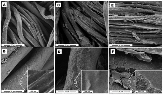 SEM-FEG images of untreated cotton textile (A,B), blue Ir@SiO2-coated textiles (C,D), red Ir@SiO2-coated textiles (E,F) at different magnification.