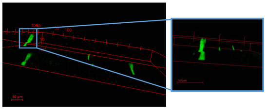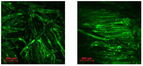 The Ir@SiO2 NPs spreading on the epidermal surface was then mapped with 2p-fluorescence microscopy. Moreover, with the use of a (620 ± 52 nm) bandpass filter, this technique enhances Ir(III)-based emission by cutting the emission from the first skin layer, thus collecting only the signal due to NPs. Observing skin samples before and after NPs exposure (Figure 10), we noticed the presence of light dots in the treated sample. A closer z-stack image analyses obtained by acquiring the first 50-µm layers in thickness (Figure 11), revealed luminescent dots that can be associated to the external part of hair channels, having dimensions about 20 µm in diameter. Images seem to confirm the behavior reported in literature for silica NPs with diameter lower than 45 nm [48]. Particularly, Ir@SiO2 NPs hypothetically released by the coated textile are stopped in the first skin layers (mainly in epidermis), reaching the hair bulbs and being stuck in them, without any strong adverse effect of the inner skin layers and tissues underneath.