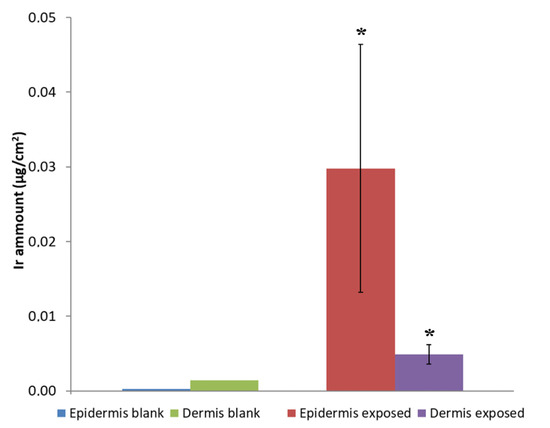 Ir distribution within human skin in blank and treated samples as determined by ICP-MS. (* values are significant different from the blank with p < 0.05).