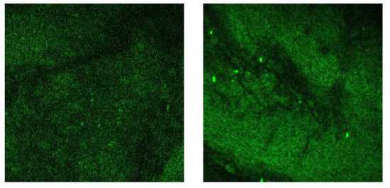 Superficial images made using a 2p-fluorescence microscope of skin sample (left) before Ir@SiO2 NPs exposure and (right) after 24 h of exposure. Image size is 500 µm × 500 µm.