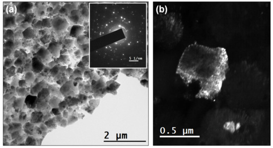 The microstructure of the NCD samples was examined using TEM. Figure 4a shows a bright field (BF) TEM micrograph of the 0.2% N2 NCD sample. The selected area electron diffraction (SAED) pattern of an area 1 µm in diameter is shown as an inset of Figure 4a. Bigger grains that were hundreds of nanometers in size are evidenced, one of which is shown in the dark field (DF) mode in Figure 4b. The sample grown with 2% nitrogen is shown in BF mode in Figure 5a. The smaller grains required higher magnification. SAED was performed in the area with an aperture of 200 nm diameter (Figure 5b). Three different reflections in DF mode are provided in Figure 5c–e to show the grains that were tens of nanometers in size.