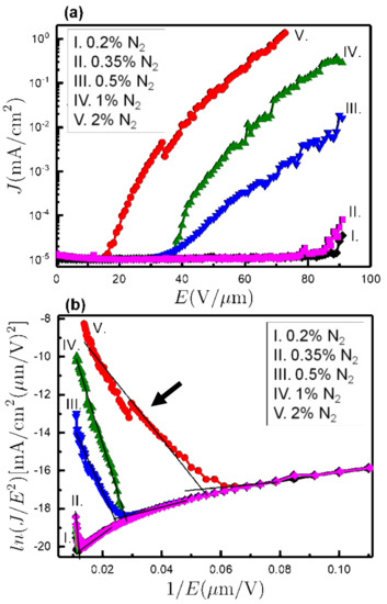 Figure 6a shows the FEE current density (J) versus applied field (E) of all co-doped NCD samples. The FEE results were Fowler–Nordheim (FN) modeled [8], from which the turn-on field (E0) was determined for each film, as shown in Figure 6b. These values, summarized in Table 2, show a drastic reduction of E0 for higher N2 content combined with a big increase in the current density. In this way, for the 0.2% N2 sample, the turn-on field was 83.7 V/µm, and the current density at 53 V/µm applied field was 10−5 mA/cm2, respectively. Similar values were obtained for 0.35% N2 (E0 = 88.5 V/µm and J = 10−5 mA/cm2) even if the SEM micrographs showed clear differences in the grain morphology between the 0.2% N2 and 0.35% N2 NCD samples (cf. Figure 1). Nevertheless, at an N2 ratio of 0.5%, the electric field for which the film can be turned on was reduced to half (i.e., E0 = 41.0 V/µm), while the current density increased to J = 22 × 10−5 mA/cm2. Interestingly, for the 2% N2 sample, E0 reached its minimum value of 18.7 V/µm, with the current density reaching 13 × 10−2 mA/cm2. Moreover, the β values were estimated from the slope (m) of FN plots (see the arrow in Figure 6b) using the relation