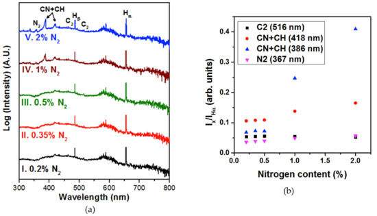 (a) OES spectra recorded during the deposition process of the five samples labelled by their N2 amount. (b) Intensity of C2, N2, and CN + CH peaks normalized to the Hα peak for each nitrogen content used.