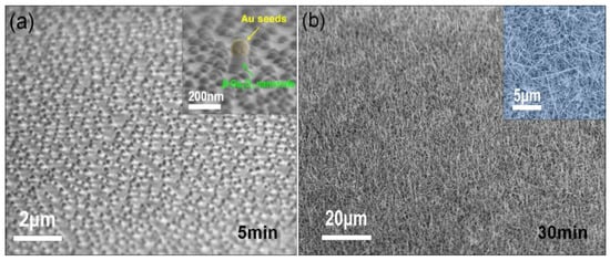 Scanning electron microscopy (SEM) images illustrating the growth process of β-Ga2O3 nanowires (a) self-assembled Au nanocrystals as catalysts while sitting on β-Ga2O3 nanorods after 5 min growth; inset shows a close-up SEM image of a β-Ga2O3 nanorod under an Au nanocrystal after 5 min growth. (b) 45 degree tilted-view SEM image of β-Ga2O3 monoclinic nanowires after 30 min growth; inset is the bird-view SEM image of β-Ga2O3 nanowires after 30 min growth.