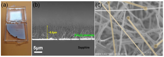 (a) A quarter of 2-inch as-grown β-Ga2O3 nanowires on sapphire wafer. (b) Cross-sectional SEM image of the as-grown β-Ga2O3 nanowires. (c) High-magnification SEM image of nanowires.