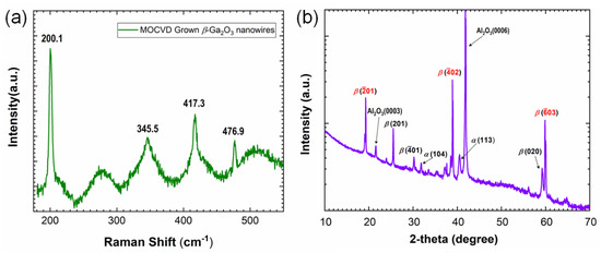 Raman analysis was performed to analyze the crystal structure on typical β-Ga2O3 nanowire samples. It can be seen that strong and sharp Raman peaks from crystalline Ga\O bonds are centered at 200.1, 345.5, 476.9 and 417.3 cm−1 in Figure 4a. This spectrum demonstrates that the nanowires present the monoclinic β-Ga2O3 phase and have a very good crystal quality [27,28]. Meanwhile, XRD was used to examine the crystal structure of the large-area β-Ga2O3 nanowires grown by MOCVD. A typical XRD pattern of as-grown sample is shown in Figure 4b. The peaks at 21° and 41° correspond to the {0001} diffraction peaks of the sapphire substrate. In addition, three dominant diffraction peaks at 18.9°, 38.4° and 59.2° are observed, which correspond to the (01), (02), and (03) planes of β-Ga2O3, respectively. It illustrates that the β-Ga2O3 nanowires are mostly (01)-oriented, which is almost paralleled to the sapphire (0001) plane [29]. Three much weaker peaks correspond to the (201), (01), and (020) planes of β-Ga2O3. It again affirms that the as-grown vertically-oriented β-Ga2O3 nanowires have the monoclinic structure (β-Ga2O3 (a = 12.12–12.34, b = 3.03–3.04, c = 5.78–5.87)), according to the Joint Committee on Powder Diffraction Standards (JCPDS) powder diffraction file No. 76-0573. [29,30]. The growth temperature (690 °C) may contribute to the diffraction peaks of the α-phase Ga2O3 nanowires in Figure 4b [31].