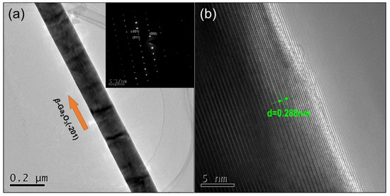 (a) Transmission electron microscopy (TEM) image of an individual β-Ga2O3 nanowire. The typical electron diffraction pattern is in the inset. (b) High-resolution TEM image of the β-Ga2O3 nanowires with uniform lattice fringes.