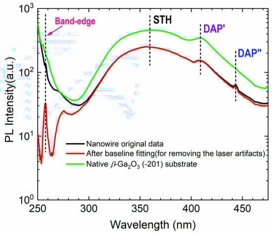 Figure 7 shows the PL spectrum obtained from β-Ga2O3 nanowires and native β-Ga2O3 (-201) substrate at room temperature at the same pumping conditions. For removing the artifacts from the laser sources, the PL spectrum from the nanowires is baseline-fitted. In the baseline fitting, to identify the intrinsic emission, the PL spectrum of nanowires is separated from the laser excitation background, as the intrinsic emissions of β-Ga2O3 is greatly overlapped with laser excitation background (see Figure 7). Emission spectral peaks centered at ~257 nm and ~275 nm can be observed, which correspond with the band-edge transitions of excited carriers that originate from the anisotropy of the monoclinic phase [36]. Aside from the band-edge emission, β-Ga2O3 nanowires exhibit two distinct spectral peaks at ~360 nm and ~410 nm, respectively, which are consistent with the PL spectral peaks of native β-Ga2O3 (-201) substrate. The peak at 360 nm is originated from recombination processes caused by self-trapped holes (STH), which is an intrinsic feature and is not due to defects. The spectral peak located at 410 nm is related to the recombination of donor–acceptor pairs (DAP), which is a result of electrons tunneling from the donor to the acceptor when photo-generated carriers are captured by donors or acceptors in β-Ga2O3. A weak spectral peak can be identified at ~440 nm for the β-Ga2O3 nanowires, corresponding to the blue band emission that strongly correlates with oxygen vacancy concentration [37]. Overall, the PL spectrum from β-Ga2O3 nanowires is highly consistent with that from native β-Ga2O3 substrate, which suggests high material quality of as-grown β-Ga2O3 nanowires.