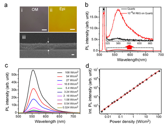 (a): (i) Optical microscopy, (ii) epi-fluorescence, and (iii) Scanning electron microscopy (SEM) (cross section showing the uniform thickness of 300 nm) images of a thin film fabricated using a poly methyl methacrylate (PMMA) C4 with 10−4 M of rhodamine 6G (R6G) (the scale bars in the optical and SEM images are 5 µm and 100 nm, respectively). (b) Photoluminescence (PL) spectrum of a 300-nm-thick film with 10−4 M of R6G and a bare quartz substrate measured using an integrating sphere. The inset illustrates a magnified portion of this spectrum for the emission range of R6G. (c) Representative confocal PL spectra of the 300 nm thick reference sample with 10−4 M of R6G at varied laser intensities under a 514-nm excitation. (d) Integrated PL intensity of a 300-nm-thick reference sample with 10−4 M of R6G as a function of the laser intensity.