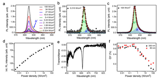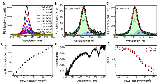 (a) Confocal PL spectra of the exfoliated 1L-MoSe2 on a quartz substrate with various laser intensities. Deconvoluted PL spectra of the exfoliated 1L-MoSe2 at (b) 0.216 W/cm2 and (c) 108 W/cm2. (d) Integrated PL intensity of 1L-MoSe2 as a function of laser intensity. (e) Representative transmittance spectrum of 1L-MoSe2. (f) Plot of the QYs of 1L-MoSe2 as a function of laser intensity, estimated using 80- and 300-nm-thick reference specimens.