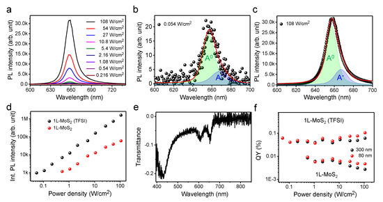 For 1L-MoS2, the effect of chemical treatment using TFSI to increase the QY was investigated because TFSI is known to enhance the QY of 1L-TMDs via the repair of the sulfur vacancies [13,14]. The laser-intensity-dependent PL spectra of the TFSI-treated CVD-grown 1L-MoS2 on a quartz substrate are depicted in Figure 4a (for the Raman spectra, see the Supplementary Materials, Figure S2c). The peak shown at ~658 nm is consistent with previous PL results obtained for 1L-MoS2 [13]. The representative deconvoluted PL spectra at low (0.054 W/cm2) and high (108 W/cm2) laser intensities are illustrated in Figure 4b,c, respectively. In these figures, it is shown that contribution of the trion recombination is ~25% for the overall emissions at all power ranges measured in this study. The PL spectra of the pristine, CVD-grown 1L-MoS2 are depicted in Figure S4 in Supplementary Materials. The PL intensities of the pristine and TFSI-treated 1L-MoS2 are depicted in Figure 4d, and the transmittance spectrum of the TFSI-treated 1L-MoS2 is illustrated in Figure 4e. In this figure, the peaks at ~655 and ~607 nm correspond to the A and B excitons of 1L-MoS2, respectively. The QYs of the pristine and TFSI-treated CVD-grown 1L-MoS2 obtained using Equation (2) with both reference samples (of 80 and 300 nm thicknesses) are plotted in Figure 4f. The QYs for the pristine and TFSI-treated samples are estimated to be 0.0093 ± 0.001% and 0.062 ± 0.01%, respectively, indicating the enhancement of QY by TFSI treatment.
