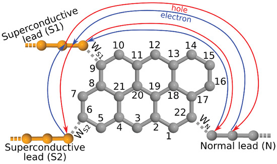 Anthanthrene molecule attached to two superconductive and one normal lead. The connectivity matrix element between the sites 6 and 22 is zero, while the connectivity between sites 9 and 22 and between sites 9 and 6 is finite. Solid lines indicate the propagation of the electron-like (blue) and hole-like (red) quasiparticles.