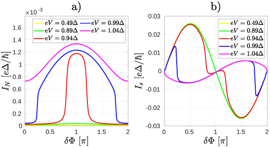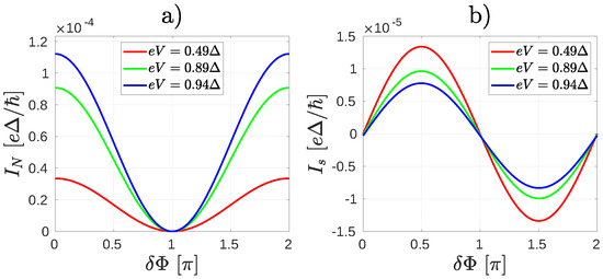 In order to understand the unconventional non-equilibrium Andreev interference effect described in the next sections, following Reference [30] we first give a brief overview of the considerations that explain the interference pattern in the current flowing through the normal lead as a function of the superconducting phase difference between the and leads (see Figure 1) in equilibrium. Under equilibrium conditions, the limit is understood, where V is the applied bias on lead N with respect to the chemical potential of the superconductors. Note that the imposition of a phase difference also generates a Josephson current flowing between the superconducting leads. Experimentally, as shown in References [44,45], can be controlled, thus allowing the measurement of the current-phase relation (CPR) of the supercurrent and the phase dependence of .