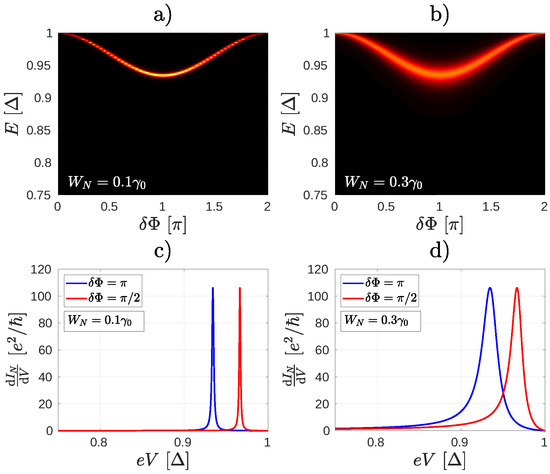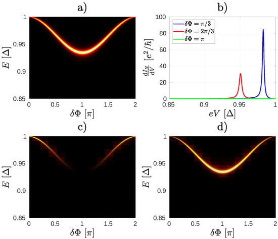where , and represents the wave function, the energy and the broadening of the qth ABS, and the quantities and are defined similarly to Equations (A14) and (A15), but the scalar product is taken between wave functions corresponding to different ABSs. Besides regular Lorentzian resonances [ terms of Equation (A18)] we see that the differential conductance is heavily influenced by the cross-talk of the individual ABSs. Mathematically the product of two fractions on the right hand side of Equation (A18) can be rewritten to a sum