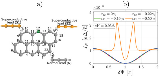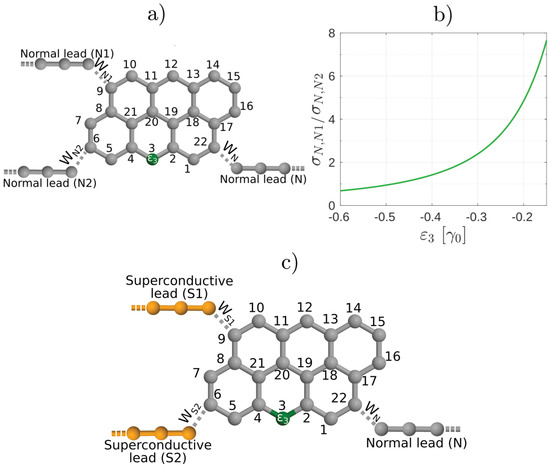 (a) Schematics of Anthanthrene molecule with a heteroatom denoted by green. (b) Ratio of the normal conductance between contacts and as a function of the on-site energy in Figure 6. At the conductance between contacts N and is much larger than the conductance between contacts N and , in agreement with References [12,23]. For finite the conductance increases and can be comparable to . (c) Andreev interferometer setup obtained by replacing the normal leads and in (a) by superconducting ones and .