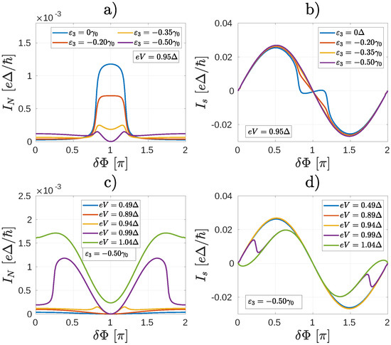 The currents (a) and (b) (b) as a function of the phase difference between the superconducting leads for the system depicted in Figure 6a for several values of the on-site energy and fixed bias . starts to show a double peak structure as a function of for . (c) and (d) as a function of the bias voltage for .