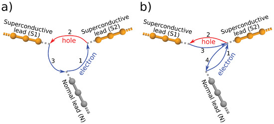 This amplitude describes a (a) propagation from the normal lead to the superconducting electrode (), (b) Andreev reflection from electrode (), (c) propagation of the hole-like state from contact to (), (d) Andreev reflection of the hole-like particle on the contact (), (e) electron-like propagation between the superconducting electrodes and (), (f) a third Andreev reflection on the superconducting electrode (), (g) and a hole-like propagation from the contact to the normal lead (). Finally, we also take into account in our minimal model the amplitude describing the direct propagation between the normal lead and the lead according to Equation (1). The observed interference effect can be explained as the interplay between these two amplitudes: