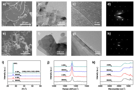 Morphology and microstructure of raw hexagonal boron nitride (h-BN) materials and exfoliated boron nitride nanosheets (BNNSs). Scanning electron microscopy (SEM) images of (a) h-BN30 and (e) h-BN2 raw materials. Transmission electron microscopy (TEM) images of (b–d) BNNS30 and (f–h) BNNS2. The diffraction spots in TEM (d,h) showed a typical hexagonal lattice. (i) X-ray diffraction (XRD), (j) Raman spectroscopy, and (k) Fourier transformation infrared spectroscopy (FTIR) spectroscopy of pristine h-BN and exfoliated BNNSs.